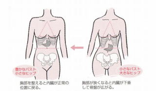 通常、肺を収めている胸郭は常に「負圧」でなければなりません。それによって胸郭より下の胃や肝臓をはじめとする内蔵を引っ張りあげているのです。この胸郭のチカラが、悪い姿勢(猫背のことですよ!)を続けることによって次第に低下してしまうのです。