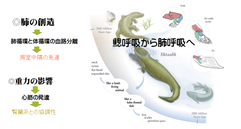 海から陸への環境の変化は我々の祖先にそれまでの鰓呼吸から「肺呼吸」を強いるようになりました。